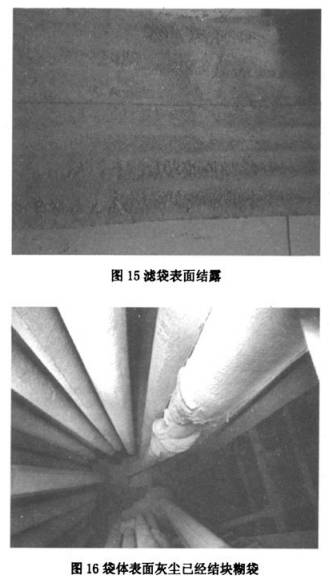 由於“四管爆裂”現(xiàn)象,導(dǎo)致水分進入(rù)除塵器,造成濾袋表麵結露、糊(hú)袋現象。