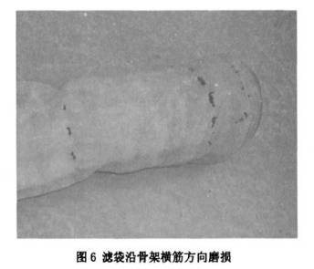 濾袋和骨架接觸部分長期由於脈衝噴吹導致接觸部分磨損,表現為很明(míng)顯(xiǎn)的橫豎筋條方向磨損 痕跡。要注意濾袋和骨架的尺寸配合、骨架表麵的光潔度等。