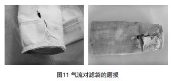 過高的過濾氣速(sù)會使(shǐ)粉塵衝擊、磨損濾袋,也會使 濾袋的織物纖維張力受(shòu)損。除塵器(qì)的進(jìn)氣分布不均,容 易使高含量的大顆粒粉塵直接衝擊(jī)局部濾袋(dài),造成廢氣(qì) 進口處(chù)部分濾袋穿孔(如圖11)。