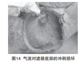 合理的設計是保證(zhèng)濾袋壽命的前提,但在袋式除(chú)塵 器設計過程中往往過分注重各(gè)項(xiàng)經(jīng)濟指標,而易忽視過 濾(lǜ)室箱體內氣流流場分布的合理性。由於氣流(liú)分布不合 理,會(huì)導致袋間速度(dù)過快,造成濾袋損壞的現象(xiàng)時有發 生。好典型的是早(zǎo)期機(jī)械回轉扁袋除塵(chén)器,其過濾箱體 內濾袋布置密集度(dù)是現有除塵器中好的,由此造成氣流對(duì)濾袋的衝刷損壞(如圖14)。濾袋的長徑比(bǐ)選(xuǎn)擇不 合理,也會造成袋(dài)口速度過快而磨損濾袋。