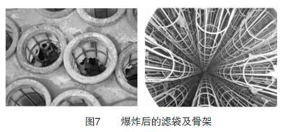 隨著袋式除塵器的普及,袋式除塵器粉塵爆炸事故也(yě)呈上升趨勢。如上海某鋼廠的(de)幹熄焦除(chú)塵係統,由於前部阻火牆製造的(de)問題,造成火星進入(rù)除塵器內從而引起爆炸,將除塵器進(jìn)口管道盲板炸出幾(jǐ)十米遠,除塵器箱體嚴重變(biàn)形(xíng)。又如沈陽某機製炭廠,由於鋸末在炭化過程中產生大量的焦油和碳氫化合物等易燃、易爆物質,而且焦油粘在濾袋上隨著時間推移(yí)越積越多(duō),當有火星進入除塵器後就引(yǐn)起了除塵器爆炸。除塵器爆炸瞬間所產生的能量可(kě)使花板嚴(yán)重變形,濾袋爆裂情況見圖7。