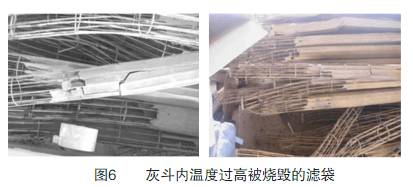 高溫粉塵被收(shōu)入灰鬥後,如果不能及時排出,粉塵會長期(qī)蓄積在灰(huī)鬥裏造(zào)成灰鬥內溫度不斷升高,濾袋長期在高溫烘烤下就會變脆、變硬,嚴(yán)重時則會燒毀,尤其是粉塵中含有的易燃(rán)物質,會在灰鬥內燃燒,從而燒毀濾袋(dài)(如圖6)。