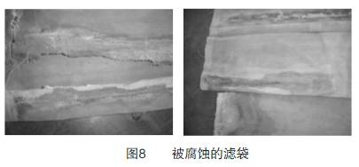 水解痕跡為顏(yán)色混濁,濾(lǜ)袋強度(dù)嚴重下降(jiàng),易破損。縫紉(rèn)線發生水解後,濾(lǜ)袋從縫(féng)紉線處開裂,使濾袋(dài)不再是筒狀。濾袋縫紉(rèn)線斷裂如圖9。