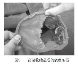 高溫(wēn)煙氣對濾袋(dài)的另外一種損害是高(gāo)溫收縮,雖然每種濾料的使用溫度不同,但當煙氣溫度超過其使用溫度後,如其經向收縮(suō)率過大,會使濾袋在長度方向上尺寸變短,濾袋袋底緊托(tuō)著骨架並受力而損壞(如圖3)。如果濾袋緯向(xiàng)熱收縮過大,將使濾袋(dài)在徑向尺寸變小,濾(lǜ)袋會緊緊箍在骨架上,甚至無法抽出骨架。從而使濾(lǜ)袋一直處(chù)於受力狀態,造成濾袋的收縮(suō)變形、變硬(yìng)、變脆(cuì),加快強度耗損、減短濾袋壽命(mìng)。由(yóu)於濾袋變形後會(huì)緊緊箍在骨架上,在清灰時濾袋難以(yǐ)變形而不利於噴吹清灰,導致濾(lǜ)袋阻力居高不下。