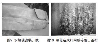 纖維氧化是纖維中分子失去(或離解)電(diàn)子的過程,如PPS纖維,在高溫(150℃)條件下氧分子攻擊分 子中的“S”,並與之結合。造成PPS纖維變色、變硬、 變脆,強度降低而破損,嚴重時(shí)纖網會破碎而脫離基布 (如圖10)。氧化是濾(lǜ)袋損壞的又一(yī)主要(yào)因素。抗氧化 性能(néng)較差的濾(lǜ)料(liào)主(zhǔ)要有:聚丙烯、聚苯硫醚(PPS)等(děng)。