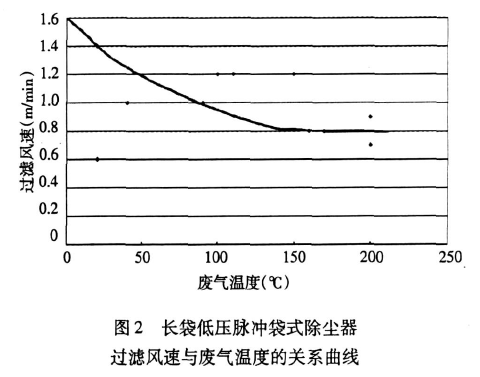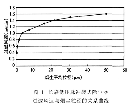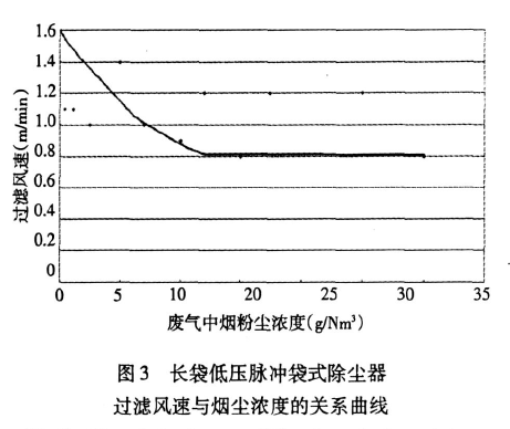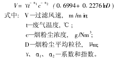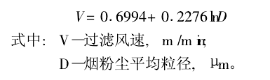 該式雖是通過曲線擬合得到的,但我們在2005年後設計脈衝除塵器時,其過濾風速的選取均是采用該模式計算,每台(tái)除塵器(qì)的除塵效果都達到了要求(除塵效率(lǜ)達到99.9%或排放口濃度小(xiǎo)於30g/Nm³)。